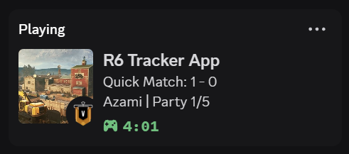 If you share your activity status on Discord, our R6 Tracker app can enhance your activity status. The app will send your current playlist, operator, score, map, rank and party size to Discord so your friends can squad up with you easier.